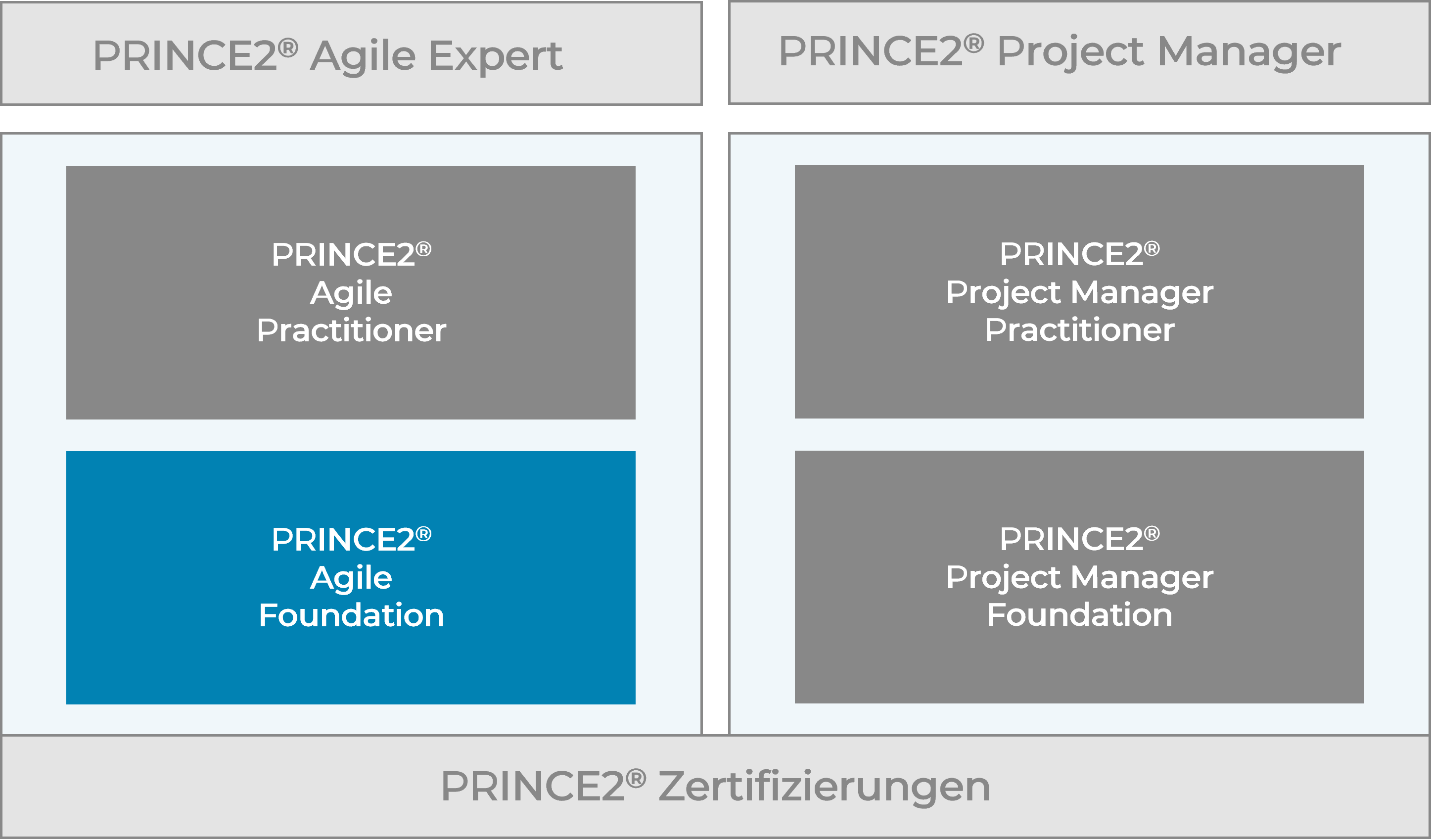 Für die Erlangung des Zertifikats „PRINCE2® Agile Expert“ müssen folgende Zertifizierungen erfolgreich absolviert werden: „PRINCE2® Agile Foundation“ und „PRINCE2® Agile Practitioner“.